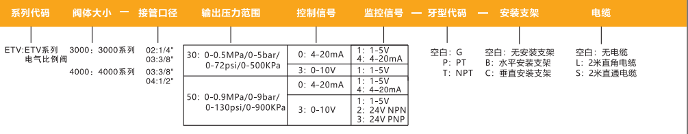 訂貨舉例:ETV系列電氣比例閥,3000系列閥體,接管口徑為1/4”,輸出壓力0-0.9MPa,控制信號0-10V,1-5V監控信號,G牙,水平安裝支架,G牙,2米直通電纜。其ERP編碼為:ETV3000-025031-BS。