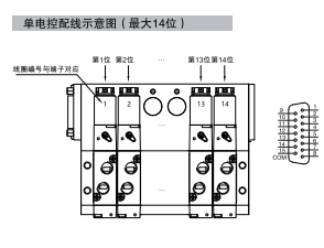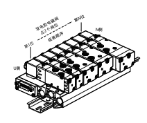 ⒉.不同規格閥混裝時:SR系列閥組,1系列,如右圖所示由第1、2位為二位五通單電控電磁閥RV5211,第3、4、5、6位為2個二位五通雙電控電磁閥SR5212,第7、8位為1個三位五通中封型雙電控電磁閥SR5312C,接管口徑為1/8,電壓為DC24V,附DIN導軌卡扣及1米DIN導軌,G牙。其ERP編碼為:S1R-2S2DC-06E4-D。