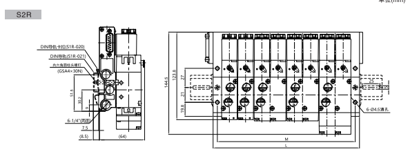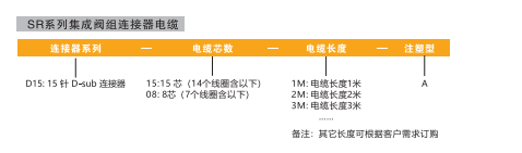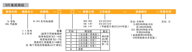 1.同規格閥時:SR系列閥組,1系列,6個二位五通單電控電磁閥RV5211,工作口接管口徑為1/8,工作電壓DC24V,無附件,G牙。其ERP編碼為:S1R-6S-06E4。
