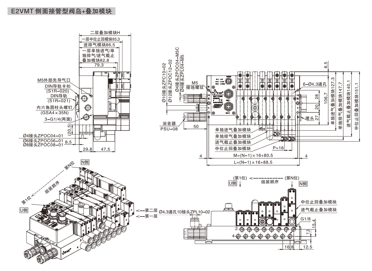 3、不同規格閥,兩層不同疊加模塊混裝時:S系列標準型,2系列,側面接管,識別碼T,PROFINET總線協議,輸出32點,第一第二閥位均為兩位五通雙電控電磁閥SVMT5222,第三閥位為進排氣模塊,第四五閥位均為兩位五通單電控電磁閥SVMT5221,第六七八閥位均為三位五通中泄型電磁閥SVMT5322E,第四閥位配單獨進氣疊加模塊?6氣管,第五閥位配單獨排氣疊加模塊,第六閥位配進氣截止疊加模塊,第七閥位配中位止回疊加模塊,第八閥位第一層配單獨進氣疊加模塊?6氣管,第二層配中位止回疊加模塊,工作口?8氣管接頭,工作電壓DC24V,內部先導式,配線方式為雙電控配線,U側安裝消音器、PL接頭,安裝DIN導軌卡扣及1米DIN導軌,G牙。