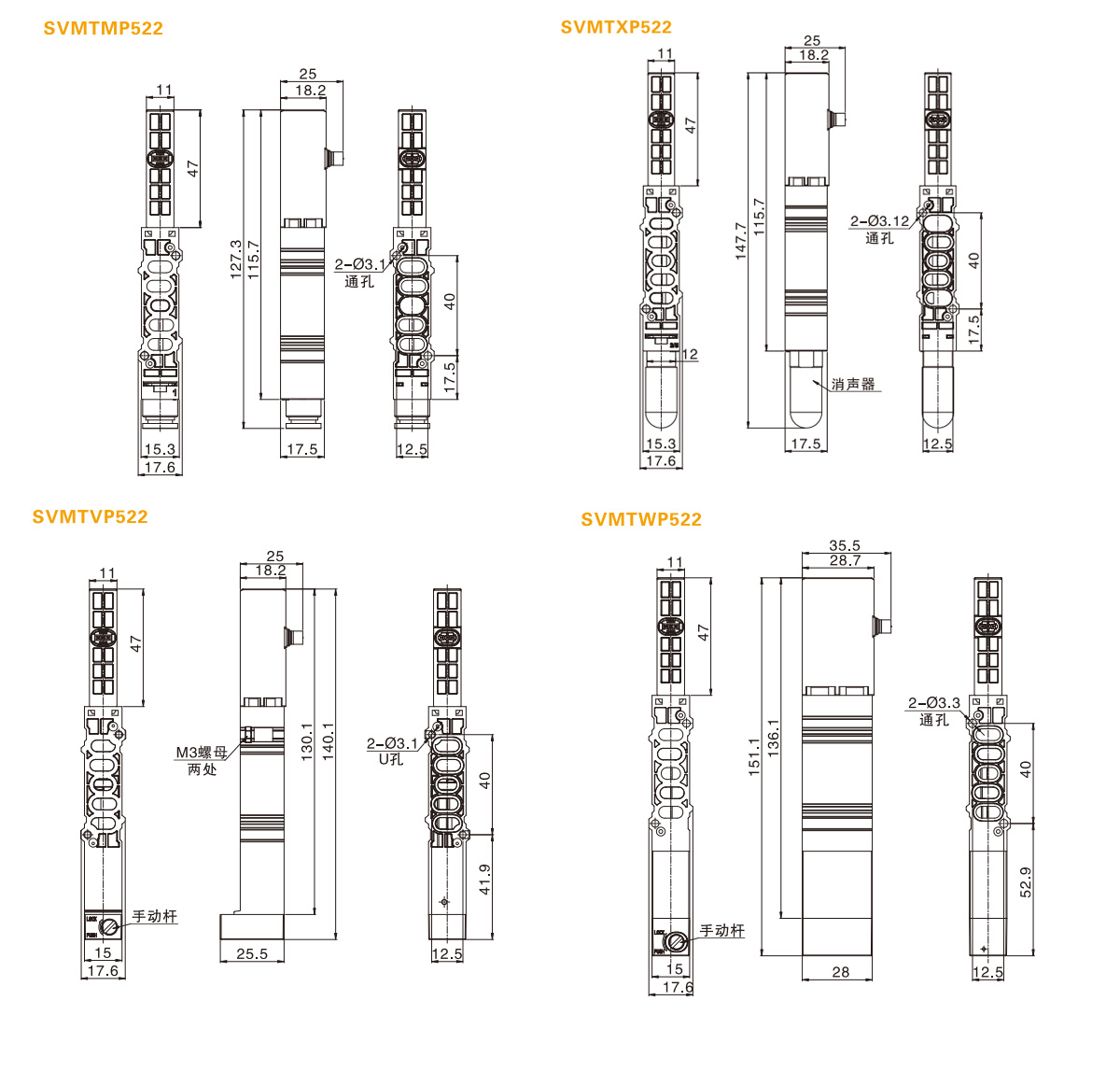 2、②進排氣模塊進氣口接管為C4/C6/C8時,排氣口默認組裝消聲器,1/8接管時,排氣口默認不組裝消聲器。