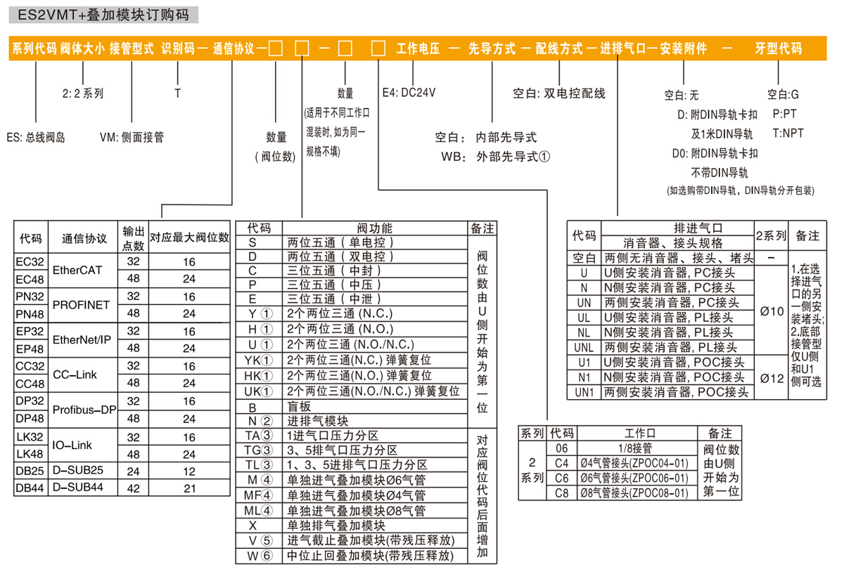 當相鄰兩個或多個閥位功能一樣時,用相同閥位總數的數字表示,比如第一至四閥位都是雙電控電磁閥,并且這4個閥位都含單獨進氣疊加模塊,則代碼為DMDMDMDM,簡化為4DM,此原則適用于所有閥組或閥島訂購碼。