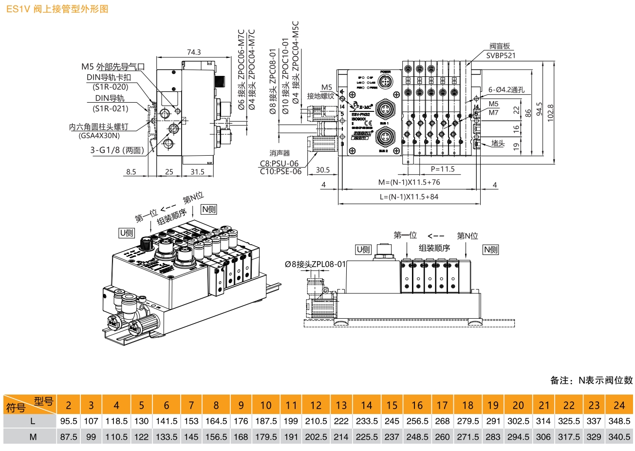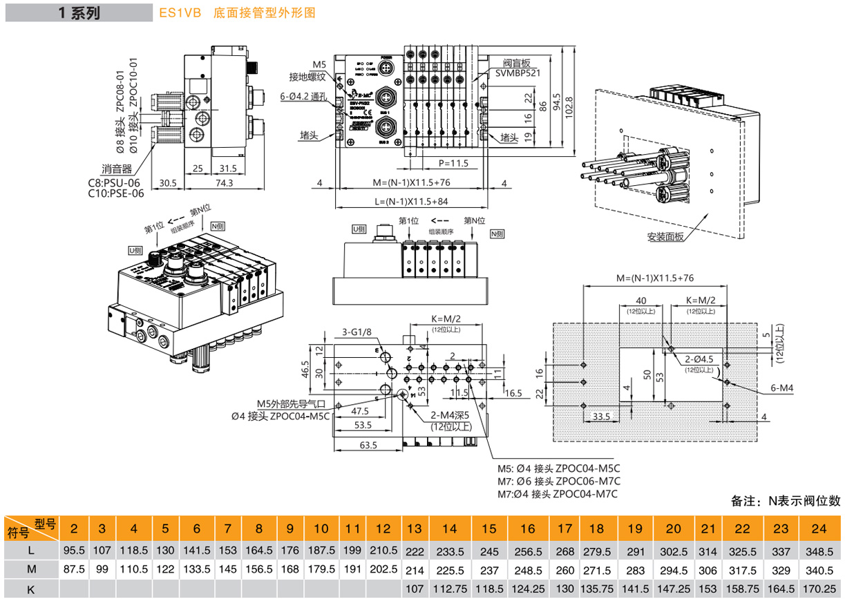 1.同規格閥時:ES系列總線閥島,1系列,閥上接管,PROFINET總線協議,輸出32點,6個兩位五通雙電控電磁閥SV5212,工作口接管口徑均為M5,工作電壓DC24V,內部先導式,配線方式為雙電控配線,進排氣口為兩側無消音器、接頭、堵頭,G牙。