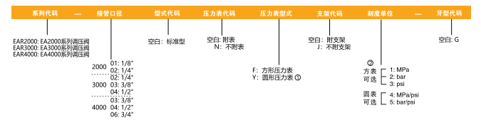 訂貨舉例:EA3000系列調壓閥,接管口徑1/2",附表,方形壓力表,附支架,刻度單位為MPa,G牙,其ERP編碼為:EAR3000-04LF1