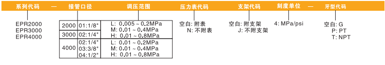 訂貨舉例:EPR3000精密調壓閥,接管口徑1/4,調壓范圍0.01~0.8MPa,附表附支架,單位刻度MPa/PSi,G牙,其訂購碼為:EPR3000-02H4