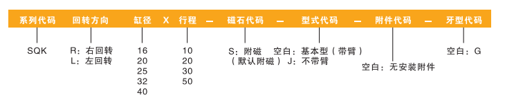訂貨舉例:SQK系列基本型氣缸,缸徑為25,夾緊行程為20,? 右回轉,本體牙型為G牙,帶擺臂,無安裝附件,其ERP編碼為:SQKR25X20-S。