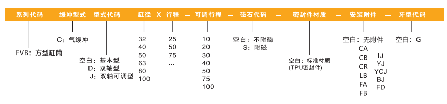 備注:如有氣缸有多種安裝附件,則依次按此順序編碼:CA/CB/CR/LB/FA/FB/IJ/YJ/BJ/FD