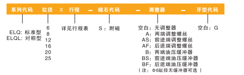 訂貨舉例:ELQ系列標(biāo)準(zhǔn)型氣缸,缸徑為20,行程為50,附磁石,無(wú)調(diào)整器,本體牙型為G牙,其ERP編碼為:ELQ20X50-S
