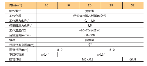 | 內徑(mm) | 標準行程(mm) | 最大行程(mm) |
