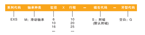 訂貨舉例:EXS系列氣缸,軸承種類為滑動軸承,缸徑6,行程30,其ERP編碼為:EXSM6X30-S