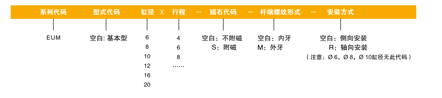 訂貨舉例:EUM系列基本型氣缸,缸徑為10,行程為20,附磁石,外牙,