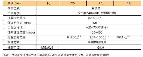 | 內(nèi)徑(mm) | 標(biāo)準(zhǔn)行程(mm) | 最大行程(mm) | ||||||||||||