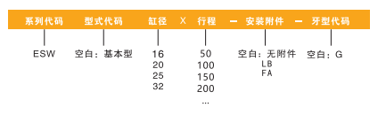 訂貨舉例: ESW系列基本型無(wú)桿氣缸,缸徑32,行程50,端蓋牙型為G牙,其ERP編碼為: ESW32X50